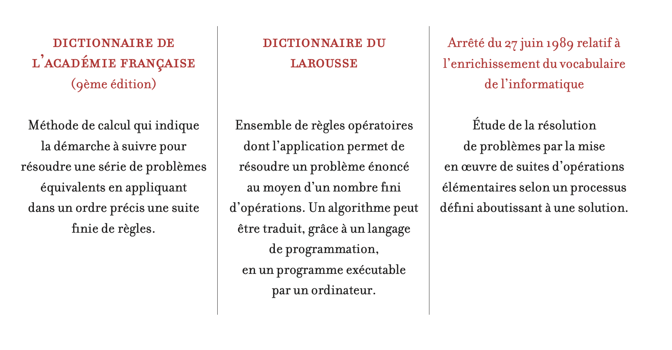 «Un algorithme est la description d’une suite d’étapes permettant d’obtenir un résultat à partir d’éléments fournis en entrée.»